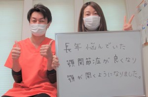 「眠れないほど痛かった顎関節症が良くなった!」 1.今までにどのような症状に悩んでおられましたか?それはいつからですか? 中学3年生の時から口が大きく開けられず、大きく開けると痛みが出た。 2.その症状をとるために今までどのようなことをされてきましたか? 痛み止めを飲んだりした。 3.その症状に対してはどんな効果がありましたか? すこし痛みが引いた。 4.何が決め手となり、当院で施術されようとおもったのですか? インターネットで調べて、顎関節症の施術ができると書いてあったので 5.私の施術と今までの施術はどのようなところが違いましたか? 痛い部分をマッサージと、身体全体のゆがみ(姿勢など)を改善する。 6.どのような方に当院をすすめたいですか? 顎関節が痛くて困っている方 7.同じような悩みを抱えている方へメッセージをください。 顎が痛くて眠れないという人でも、しっかり身体全体のゆがみを良くして、根本改善をすれば、夜も眠れるようになりますよ。 (坂本様) ※効果には個人差があります |