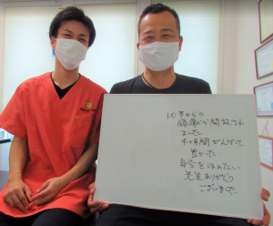 「ずっと悩んでいた腰痛が良くなりました!」 1. 今までにどのような症状に悩んでおられましたか?それはいつからですか? ずっと前から腰の痛みで悩んでいた 2.その症状をとるために今までどのようなことをされてきましたか?また、その施術はどんな効果がありましたか? 他の整体に行ったその時は効果があった 3.何が決め手となり、当院で施術されようとおもったのですか? 根本的に改善するというのに魅かれて 4.私の施術と今までの施術はどのようなところが違いましたか? まったくよくならなかった痛みがここに来て良くなった 5.どのような方に当院をすすめたいですか?また、同じような悩みを抱えている方へメッセージをください。 どこに行ってもよくならない人は試しに来てみてください (S・Z様) ※効果には個人差があります |